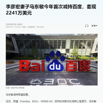 【李彦宏妻子马东敏,极为低调的少年天才】马东敏减持百度或对美国加息临近、美股的风险作出的明智判断。无独有偶,截至2024年7月,英伟达创始人黄仁勋已套现至少12.575亿美元。马东敏去年套现了2亿美元,今年7月初套现了2200万美元,很多不知情的网友说马东敏也准备跑路了?其实不然,前几个月璩静事件爆发后,有媒体曝光马东敏在美国陪女儿上学。